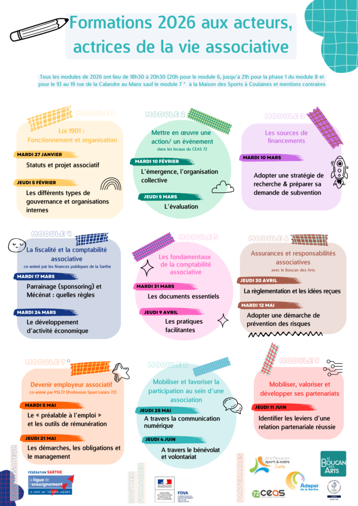 Chaque année, pour aider les bénévoles dans la conduite et le développement de leur projet associatif, la Ligue de l’enseignement – FAL 72 conçoit et réalise un programme de formations à moindre coût à destination des élues et élus associatifs ou bien les bénévoles désireux d’intégrer le conseil d’administration de leur association. Ainsi, cette formation à la vie associative aide les débutants, débutantes ou confirmé.es.