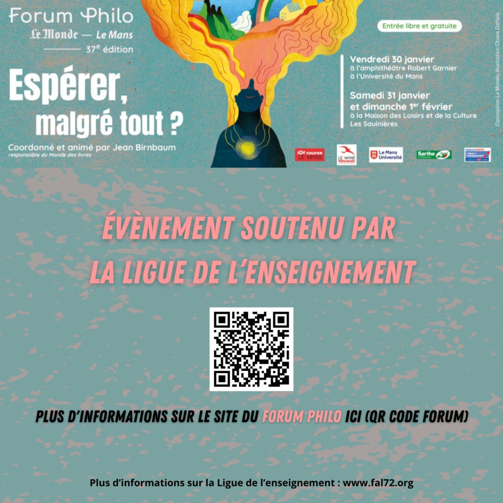 La Ligue de l’Enseignement – Fal 72 apporte son soutien au Forum Philo, organisé par l’association “Association du Forum Philo Le Monde Le Mans”, un rendez-vous ouvert à toutes et tous consacré à la réflexion philosophique et au débat citoyen.